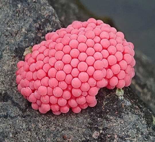 •DO NOT touch their eggs directly as they may contain neurotoxins. Instead, you can use gloves or some object to scrape/crush the eggs or knock them into the water.• If you see significant amounts of egg clusters call this number 225-765-3977 to report the invasive species to Louisiana Wildlife and Fisheries.